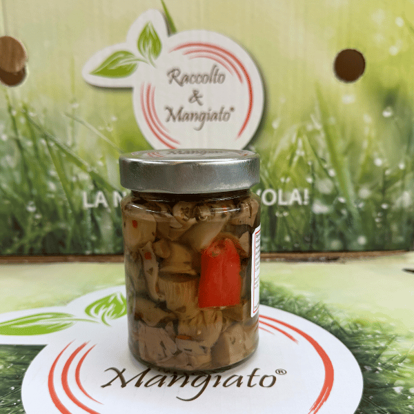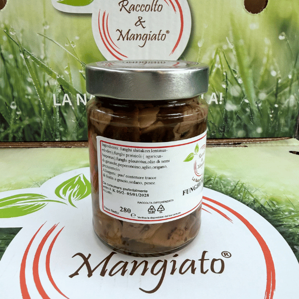 INGREDIENTI: funghi pleurotus 35%, funghi shitakee (lentinus-edodis) 25%, funghi di muschio (volvarea-volvacea) 8%, peperoncino, aglio, origano, olio di semi di girasole.